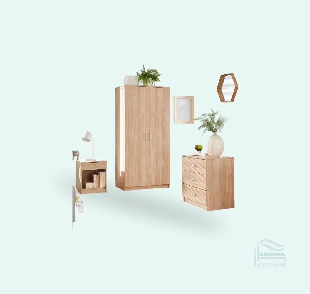 Versatile Storage Mix: Includes a spacious 3-door wardrobe, a 5-drawer chest, and a multi-functional bedside table to handle all your hanging and flat storage needs.